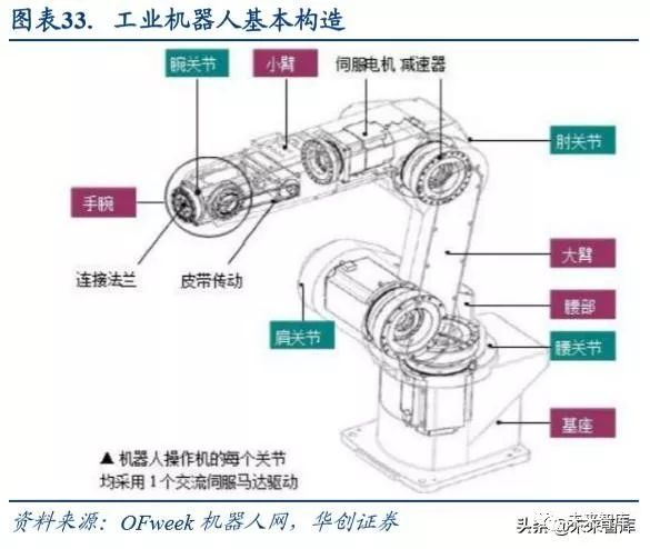 工业机器人产业链包括上游核心零部件、中游机器人本体和下游集成应用三部分。上游是控制器、伺服电机、减速 器、传感器、 末端执行器等零部件的生产厂商, 控制器、伺服电机和减速器是工业机器人三大核心零部件;中游 是本体生产商,负责工业机器人本体的组装和集成,即机座和执行机构,包括手臂、腕部等,部分机器人本体还包 括行走结构;下游是集成应用商,负责根据不同的应用场景和用途对工业机器人进行有针对性地系统集成和软件二 次开发。