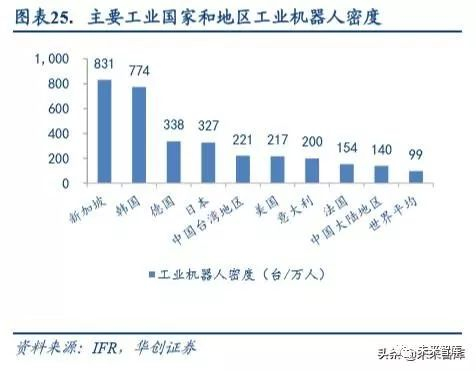 我国工业机器人密度与发达国家相比还有较大的提升空间。根据 IFR 公布的数据,2018 年工业机器人密度(每万名 制造业员工拥有的机器人数量)最高的是国家是新加坡,达到 831 台/万人,其次是韩国,达到 774 台/万人,德国、 日本以及美国等发达国家工业机器人密度也均在 200 台/万人以上。而中国是 140 台/万人,略高于全球平均水平。作为一个制造业大国,对标其他发达国家,我国工业机器人密度还有较大的提升空间。随着《中国制造 2025》国家 战略的稳步实施,国内制造业转型升级步伐将逐步加快,机器人密度将大幅增加,假设达到日本的水平,则我国工 业机器人是一个千亿级别的市场,未来发展潜力巨大。