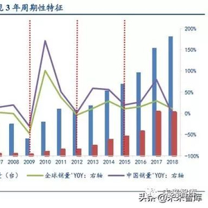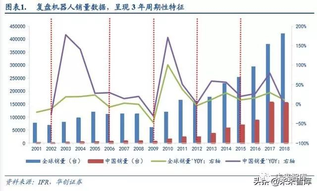 通过复盘 IFR 公布的 2001 年至 2018 年的工业机器人销量历史数据,全球工业机器人和中国工业机器人的销量增速 有着较为相似的变化趋势,表现出 3 年左右的周期性。从增速低谷到下一个周期低谷的时间段分别为:2002-2006 年, 2006-2009 年,2009-2012 年,2012-2015 年。如果周期性继续延续,现在机器人销量增速应该处于另一个周期性低 谷,销量增速将迎来拐点,机器人行业将有所复苏。