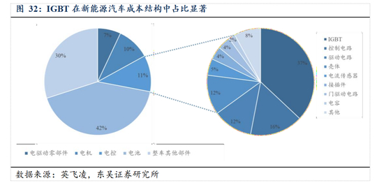 同时,新能源汽车中的功率半导体价值量提升十分显著,根据英飞凌的数据,新能源中汽车功率半导体器件的价值量约为传统燃油车的 5 倍以上。其中,IGBT 约占新能源汽车电控系统成本的 37%,是电控系统中最核心的电子器件之一,因此,未来新能源汽车市场的快速增长,有望带动以 IGBT 为代表的功率半导体器件的价值量显著提升, 从而有力推动 IGBT 市场的发展。