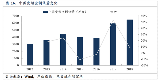 IGBT 是白色家电实现变频功能的核心元器件,其高频开闭合功能能够带来以下优点:(1)较小的导通损耗和开关损耗;(2)出色的 EMI 性能,可通过改变驱动电阻的大小满足 EMI 需求的同时保持开关损耗在合理范围内;(3)强大的抗短路能力;(4)较小的电压尖峰(对家电起到保护作用)。中国作为全球最大的家电市场和生产基地, IGBT 的应用潜力十分强劲。以空调行业为例,根据产业在线的数据,2018 年我国变频空调销量达 6434.10 万台,同比增长 8.76%,并且未来变频空调有望在空调市场进一步渗透,面向变频空调应用的 IGBT 的市场空间将十分广阔。