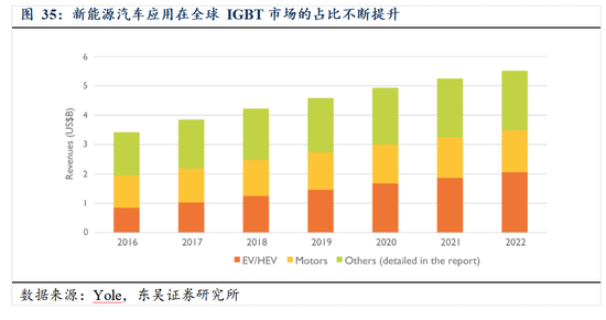 新能源汽车应用在全球 IGBT 市场的占比不断提升,根据 Yole 的数据,预计全球IGBT 市场规模将在 2022 年超过 50 亿美元。其中电动车(EV/HEV)动力系统的电气化, 将成为助推全球 IGBT 市场增长的主要力量。2016 年全球电动车(EV/HEV)IGBT 市场规模约 9 亿美元,而到 2022 年,该领域市场规模有望达到 20 亿美元,将占据 IGBT 总体市场的 40%。