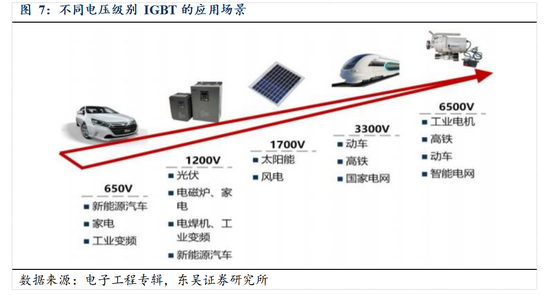 受益于工控、家电及新能源应用推动,IGBT 市场持续增长:IGBT 正逐步发展为中高端功率半导体器件的主流应用形态。随着工业控制及电源行业市场的逐步回暖,IGBT 在此领域的市场规模有望逐步扩大;随着节能环保的大力推行,具有变频功能的白色家电的市场前景十分广 阔,将为 IGBT 市场的增长提供稳定的市场需求;IGBT 是光伏逆变器和风力发电逆变器的核心器件,新能源发电行业的迅速发展将成为IGBT 行业持续增长的全新动力;IGBT 是新能源汽车电机控制器、充电桩等设备的核心元器件,随着新能源汽车市场的快速发展,新能源汽车中以 IGBT 为代表的功率半导体产品的需求量和单车价值量有望进一步提升,从而有力推动IGBT 市场的发展。