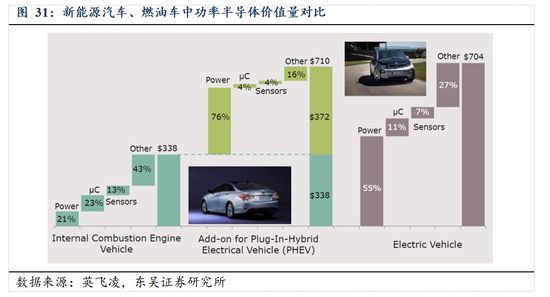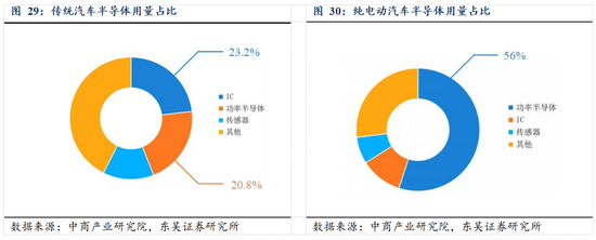 随着新能源汽车市场的快速发展和智能驾驶技术的应用,新能源汽车中以 IGBT 为代表的功率半导体器件产品的需求量有望进一步提升。根据中商产业研究院的数据,传统汽车中功率半导体在汽车半导体中的用量占比约为 21%,低于 IC 产品的用量(23%),但在纯电动新能源汽车中,功率半导体的用量显著增加,在汽车半导体中的用量占比约达 56%。