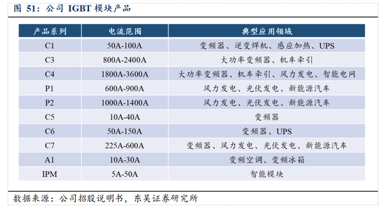 深耕 IGBT 等功率半导体领域,产品布局完善。公司自 2005 年设立以来一直专注于 IGBT 的自主研发,公司的 IGBT 模块型号齐全,目前形成了覆盖工作电流 5A-3600A、工作电压 600V-3300V 的产品布局。同时,公司还具备 MOSFET 模块、IPM 模块、整流模块、晶闸管、碳化硅器件等产品的供应能力,在功率半导体功率形成了完善的产品布局。