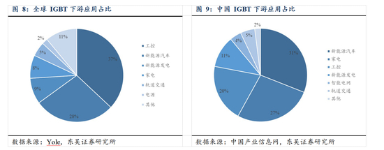 目前,全球市场上,工控、新能源和家电市场是 IGBT 的主要应用领域,根据 Yole 的数据,2017 年,工控领域IGBT 的市场规模为 17.32 亿美元,占比为 37%;新能源汽车领域 IGBT 的市场规模为 13.10 亿美元,占比为 28%;新能源发电领域 IGBT 市场规模为 4.21 亿美元,占比 9%;家电领域 IGBT 的市场规模为 3.74 亿美元,占比为 8%。而在国内市场,根据中国产业信息网的数据,2018 年,新能源汽车领域 IGBT 的市场规模为 50.19 亿元,占比为 31%;家电领域 IGBT 的市场规模为 43.71 亿元,占比为 27%; 工控领域 IGBT 的市场规模为 32.38 亿元,占比为 20%;新能源发电领域 IGBT 的市场规模为 17.81 亿元,占比 11%。
