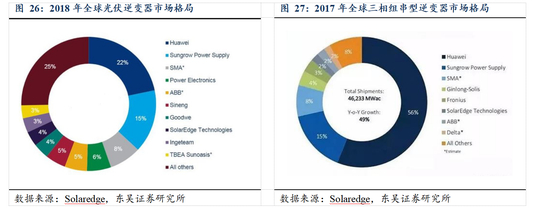 目前,以华为、阳光电源为主的本土厂商在光伏逆变器市场持续突破,根据 Solaredge 的数据,2018 年,华为在全球逆变器市场的份额达 22%,市占率位列全球第一,阳光电源的市场份额为 15%,市占率位居全球第二位。特别是在三相组串型逆变器市场,2017年华为的市占率已达 56%,市场优势地位突出,本土光伏逆变器厂商的快速发展和突出的市场地位也为国产 IGBT 替代带来了显著的区位优势和协同效应。