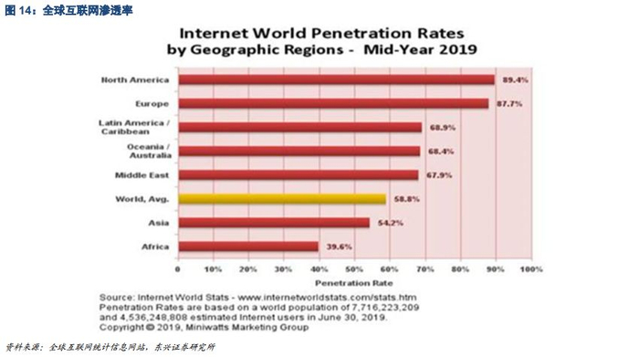 根据全球互联网统计信息(Internet World States)最新统计数据显示,2019年全球互联网渗透率为58.8%,全球仍有约31.8亿人口没有被互联网普及。其中,亚洲和非洲占据了全球72.1%的人口但互联网渗透率分别只有54.2%和39.6%,低于全球互联网渗透率的平均水平。照此计算,仅亚非两个大洲就拥有27.4亿未“互联”人口,约占全球互联网未普及人数的86%。由于地面基站易受地形和环境制约,这些地面信息系统无法覆盖的地区和人口将是卫星通信广阔的市场空间。未完成互联网建设的国家主要是因为人口密度低,建立基站不合算或是人口密度高却缺少资金。但由于联合国的网速统计标准是256K,因此即使是被互联网覆盖的41.2%的人口中,仍有部分人口仍处于2G和3G之间。