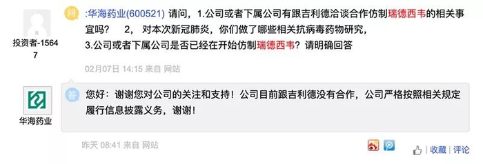 但也有华海药业、上海医药、天药股份等公司,撇清了与瑞德西韦的关系。