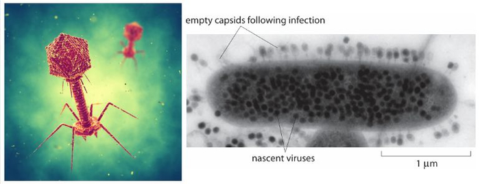 左:噬菌体示意模型;右:细菌细胞中塞满了新生产的噬菌体(图片来源:http://book.bionumbers.org/)