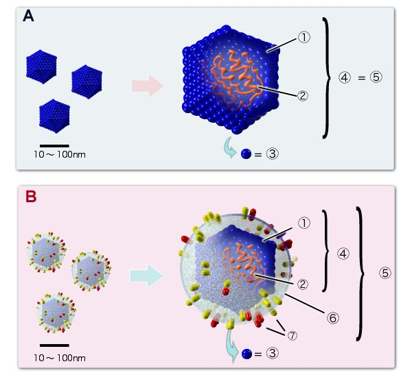A.无包膜病毒;B.具包膜病毒。①衣壳,②核酸,③壳粒,④核衣壳,⑤病毒体,⑥外套膜,⑦刺突蛋白(图片来源:维基百科)