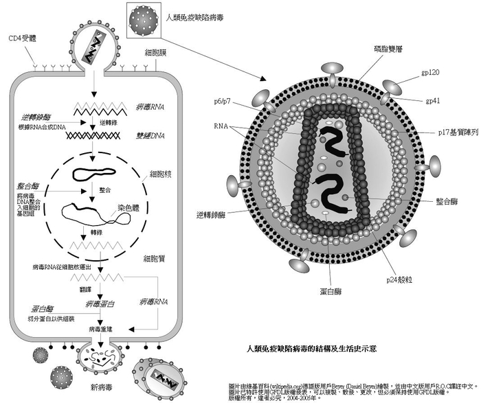最终,病毒制造的DNA会被送入细胞核,整合到宿主细胞自身的基因组中。如此一来,细胞就会源源不断地“主动”替病毒转录出更多信使RNA来,大大提升了生产新病毒的效率。这也是艾滋病人终身很难摆脱艾滋病毒的原因,因为就算能把所有艾滋病毒都清除掉了,它们的基因仍旧在部分身体细胞里潜伏着。