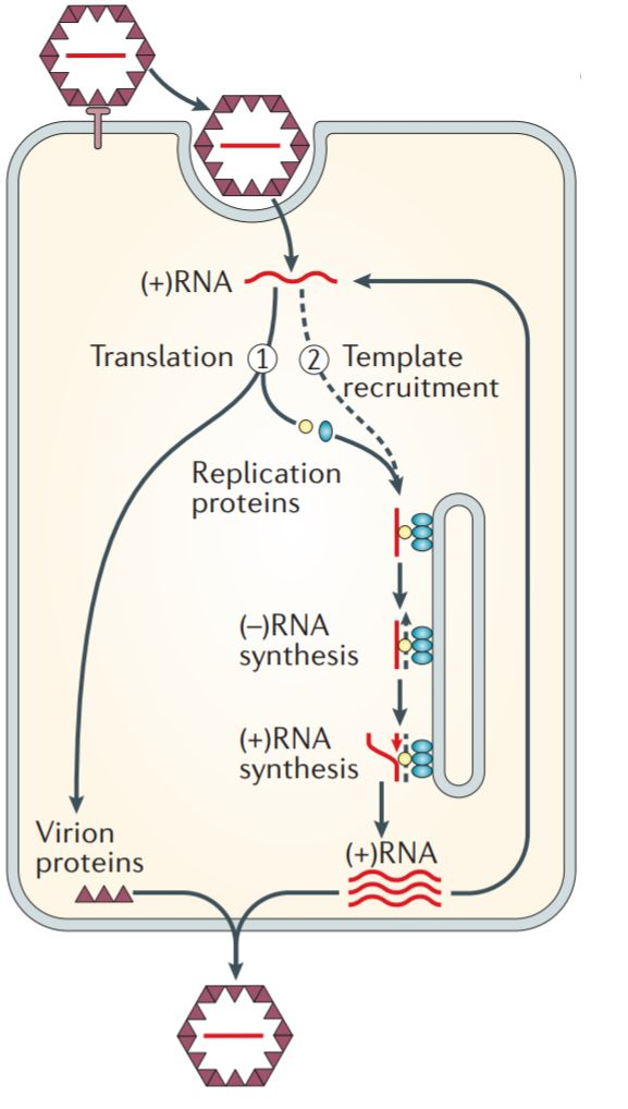 正义单链RNA病毒侵染细胞并复制的过程(图片来源:Nature Reviews, 2006,4:371-82)