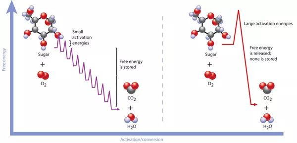 左:葡萄糖分子在细胞内逐级氧化,可控释放能量;右:葡萄糖通过燃烧剧烈释放能量(图片来源:http://www.nature.com/)
