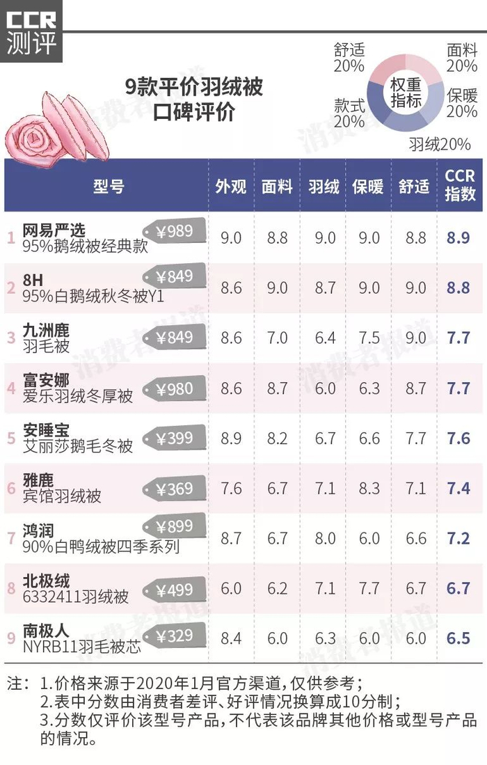 结果显示,9款1000元以下的平价羽绒被中,网易严选、小米生态链的8H表现出色,CCR指数分别为8.9分、8.8分。