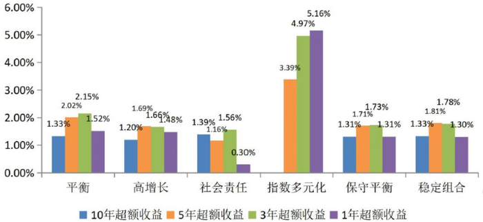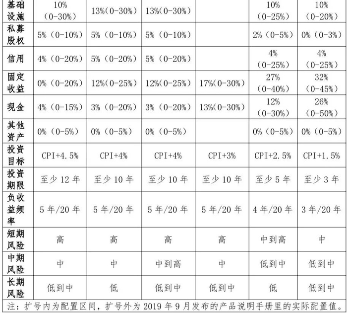 (4)指数多元化(Indexed Diversified)。使用指数策略,投资于多种资产;容忍短期波动,获取中长期收益。投资目标是中长期实现年均CPI+3%。最低投资期限为10年。风险控制在每20年里负收益的年份不多于5年。