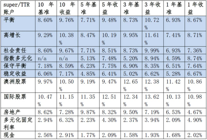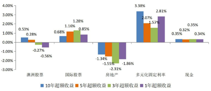 从超额收益来看,与投资基准相比(具体投资基准见附录三),CI和super/TTR的各个组合的投资收益均超越基准,1年、3年、5年、10年的实际投资业绩都高于投资基准,其中指数多元化超额收益最高。CI和super/TTR的各类可投资产的超额收益中,多元固定利率在1年、3年、5年、10年都最高且为正,国际股票超过基准,澳洲股票在1年和3年不及基准,5年和10年超过基准,房地产则是各年都不及基准。