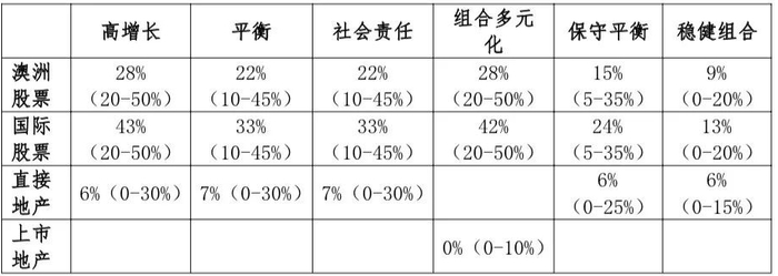 (1)高增长组合(High Growth)。主要投资于澳洲和国际股票;容忍短期波动,旨在获取较高的长期收益。投资目标是在中长期战胜年均CPI+4.5%,在中长期击败增长基金的平均收益。最低投资期限为12年。风险控制在每20年里负收益的年份不多于5年。
