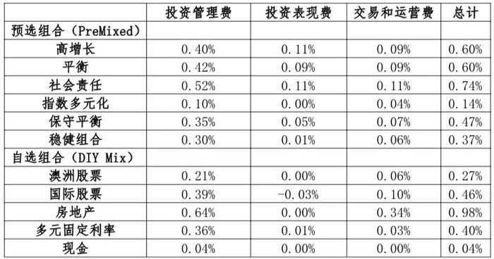 (1)投资费用。投资费用由三部分构成,分别是投资管理费、投资表现费、交易及运作费(每种组合和产品的投资费用不同,TTR各组合及产品的投资费用详见表7,CI账户的收费基本与TTR账户一样,不同仅在于高增长组合中的投资表现费率为0.10%,低于TTR账户的0.11%。)。以平衡组合为例,投资费用为账户金额的0.6%,假设投资到平衡组合中5万澳元,此项费用将为300澳元。每年6月30日,在投资收益划拨给会员账户之前,从税前投资收益中扣减(如果关闭账户则扣减时间会早些)。