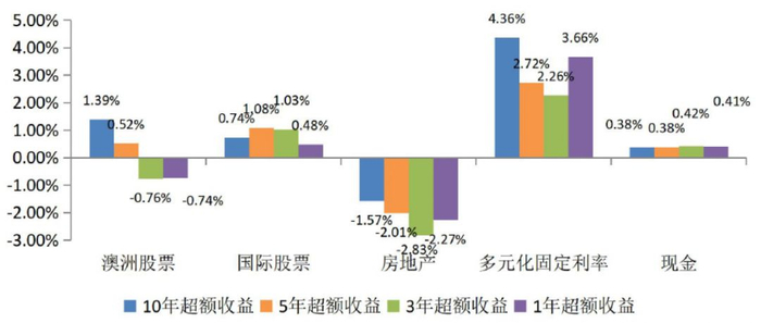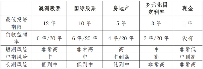 从可投资产来看,年度收益最高的是澳洲股票,年度收益率为12.18%;其次为国际股票,年度收益率为11.80%;多元化固定利率、房地产次之;现金收益最低,年度收益率为2.38%。从10年期来看,国际股票收益最高,年均收益率为12.50%;其次为澳洲股票,年均收益率为11.83%;房地产、多元化固定利率次之;现金年均收益最低,为3.37%。
