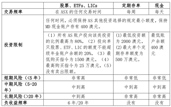 自己操盘并不适合每个人,而且风险很高。该项安排需要会员深谙投资和市场,可以管理自己的投资。TTR账户下,未纳入会员直投这一投资选择。AS对于会员直投提出了较高的申请门槛。具体申请条件包括:(1)CI会员账户必须有至少5万澳元。(2)超级年金账户必须有至少1万澳元。(3)如果会员既有超级年金账户,又有CI账户,则只能有其中之一可以选择MD投资安排。(4)当从MD账户转到CI账户,且申请了无缝对接ST,则MD的资产可以转移到CI。(5)任何时间至少在现金账户有400澳元。(6)会员必须至少有1万澳元或是收入支付储备(以更高的一个为准)投资到PreMixed或DIY中的至少一个。收入支付将从MD账户之外的其他账户进行扣减。(7)对于股票、ETFs、LICs及定期存单的投资有限制。(8)当开始MD投资后,会员的CI账户必须有至少3万澳元;当总账户余额低于3万澳元时,会员将不得不退出MD投资安排。