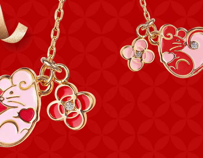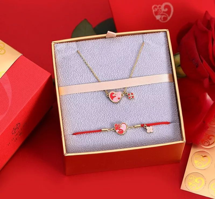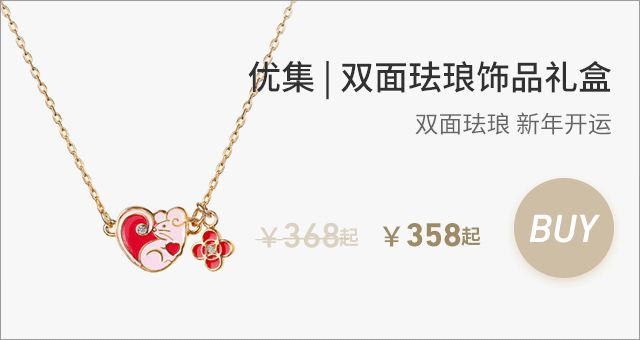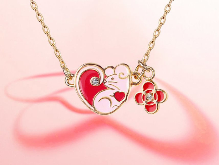 优集这款饰品的吊坠设计得颇为巧妙:一只小福鼠,翘起尾巴,环成心形,手捧一颗爱心,有着“心心相印”的意思,预示着鼠年将被爱与幸福所围绕;一旁钱币组合成花朵造型,有招财纳福之意,传达出“鼠”你有钱花的祝愿。
