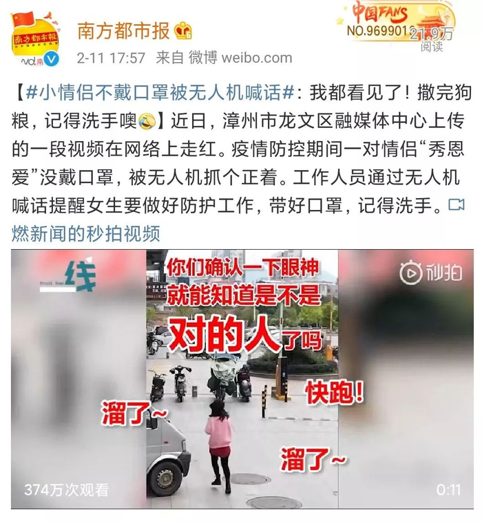就算能够线下见面,也得受到疫情防控工作人员的“监视”。前几日,漳州一对情侣在街头见面时,就被无人机抓个正着。工作人员就通过无人机喊话提示他们戴好口罩、记得洗手。