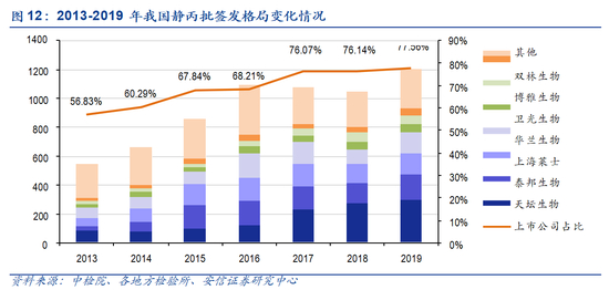 从市场竞争格局来看,2013 年以来,我国静丙市场集中度同样提升明显,7 家上市公司(天坛、华兰、泰邦、莱士、卫光、双林、博雅)的市场份额从 2013 年的 56.83%提升至 2019 年的 77.56%。但自 2017 年以来,7 家上市公司的市场份额提升速度明显放缓,这可能与上市公司在静丙去库存压力较大的背景下,主动调整生产计划,加大特免的生产有关。