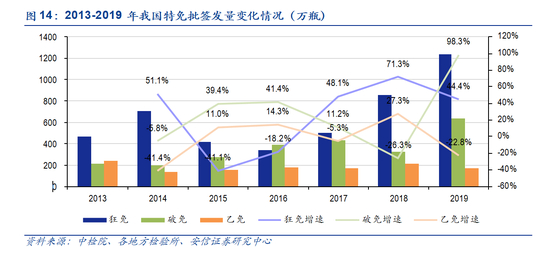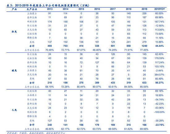我国特异性免疫球蛋白(特免)主要包括狂犬病人免疫球蛋白(狂免)、破伤风人免疫球蛋白(破免)、乙肝人免疫球蛋白(乙免)3 种;从历史批签发数据来看,我国狂免与破免批签发量整体呈现上升趋势,乙免批签发量整体呈现下降趋势,尤其是 2016 年以来,我国狂免批签发量实现快速增长,年复合增速达 54.2%。近年来,我国狂免与破免批签发量快速增长, 这一方面与终端对其临床必要性的认知度加深有关,另一方面也与生产企业在静丙承压的环境下,主动加强狂免与破免的生产与市场推广有关。与之相反,受乙肝预防与治疗手段不断完善等因素影响,我国乙免市场需求不断萎缩。2019 年,我国狂免、破免、乙免的批签发量分别为 1240 万、633 万、166 万瓶,同比增长 44.4%、98.3%、-22.8%,对应市值 22 亿、19 亿、4 亿元。