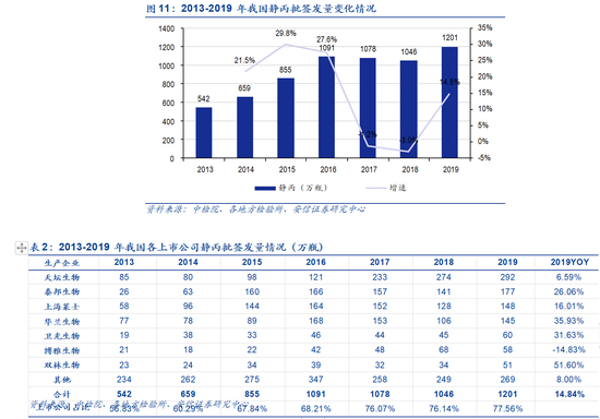 资收益,则对应公司血制品业务的 2019 年净利润为 8.3-9.4 亿元,同比增长 2%-16%;按中位数测算,对应净利润约 8.8 亿元,同比增长 9%。根据中检院数据披露,公司白蛋白(折合 10g/瓶)与静丙(折合 2.5g/瓶)2019 年批签发量分别为 236 万和 139 万支,同比增长-10%和 31%,尤其是白蛋白 19Q4 批签发量仅 48 万瓶,同比增长-40%;预计白蛋白批签发量季度间波动及血制品成本上升是造成血制品业绩增速低于预期的主要原因。但我们认为,白蛋白季度间批签发波动主要与行业监管趋严及血制品静臵期延长等短期影响因素有关,公司血制品未来批签发有望实现稳健增长。同时,在本次新型肺炎疫情的影响下,公司血制品业务增速有望进一步提升。