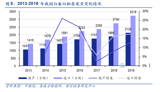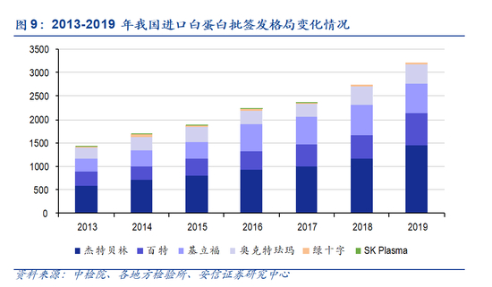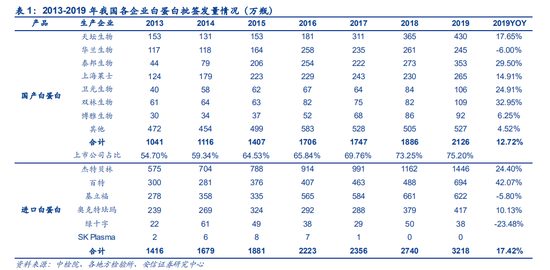 白蛋白是我国最主要的血制品品种,也是唯一允许进口的人源血制品,2013-2019 年我国进口与国产白蛋白批签发量均保持快速增长,年复合增速分别为 15.3%和 17.8%,进口增速略高于国产。2019 年,我国进口与国产白蛋白批签发量分别达到 3218 万和 2126 万瓶,同比增长 17.4%和 12.7 %,对应市值分别为 135 亿和 87 亿元。2019 上半年,进口白蛋白因注册证到期等原因批签发量相对较少,但在换证完成后,下半年批签发量迅速回升,全年批签发呈现前低后高。