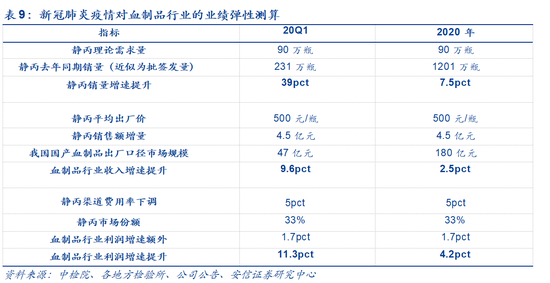 根据上述测算,20Q1 新冠肺炎患者和一线医护人员对静丙的理论需求量将超过 90 万瓶。假设本次疫情对静丙销售的影响主要集中于 20Q1,并以静丙批签发量近似为当期实际销量(19Q1 和 2019 年批签发量分别为 231 万和 1201 万瓶),则本次疫情有望为我国静丙 20Q1和 2020 年的销量增速分别带来约 39pct 和 7.5pct 的提升。