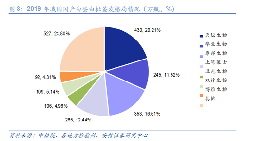 从市场竞争格局来看,2013 年以来,我国国产白蛋白市场集中度提升明显,7 家上市公司(天坛、华兰、泰邦、莱士、卫光、双林、博雅)的市场份额从 2013 年的 54.70%提升至 2019 年的 75.20%;这也使得龙头企业能够取得明显高于行业平均水平的业绩增速。