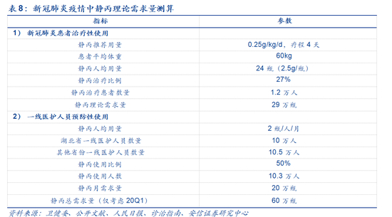 假设一线医护人员预防性使用静丙的比例为 50%,人均用量为 2 瓶/人/月,则一线医护人员的静丙月需求量约 20 万瓶,20Q1 的总需求量约 60 万瓶。