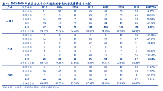 由于凝血因子类产品的技术壁垒较高,国内拥有凝血因子类产品批件的企业数量有限。7 家上市公司中,2013-2019 年拥有八因子批签发记录的只有华兰生物、泰邦生物、上海莱士 3 家,三者占国内 2019 年批签发量的 84.91%;2013-2019 年拥有纤原批签发记录的有泰邦生物、博雅生物、上海莱士、卫光生物、华兰生物 5 家,其中泰邦生物与博雅生物占据主要市场份额,且泰邦生物批签发快速上量;2013-2019 年拥有 PCC 批签发记录的只有泰邦生物、华兰生物 2 家,二者占国内 2019 年批签发量的 98.46%。