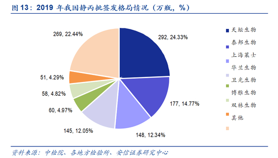 2019 年,我国静丙批签发量 CR4 达到 63.49%,天坛生物、泰邦生物、上海莱士、华兰生物的批签发占比分别为 24.33%、14.77%、12.34%、12.05%。