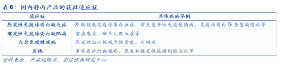 在国内外市场,静丙正式获批的适应症数量均相对有限。其中,FDA 批准静丙 6 种适应症, 分别为 B 细胞慢性淋巴细胞白血病、川崎病、免疫性血小板减少性紫癜、原发性体液免疫缺陷、多灶性运动神经病、慢性炎性脱髓鞘性多发性神经病;我国静丙的获批适应症主要集中在原发性免疫球蛋白缺乏症、继发性免疫球蛋白缺陷病、自身免疫性疾病。