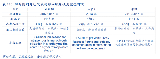 从已使用静丙的患者人均用量来看,我国静丙的临床平均用量同样远低于国外水平。根据已发表文献数据,2007-2015 年期间,以色列一家医院 1117 名患者的静丙人均用量高达 148g,折合 59.2 瓶(2.5g/瓶);2014 年,加拿大一家医院 178 名患者的静丙人均用量高达 90g,折合 36.1 瓶(2.5g/瓶)。而我国某综合性三甲医院 2013-2015 年期间 1411 名患者的静丙人均用量仅为 27.4g,折合11 瓶(2.5g/瓶),分别相当于以色列和加拿大用量的 18.5%和 30.4%,提升空间可观。