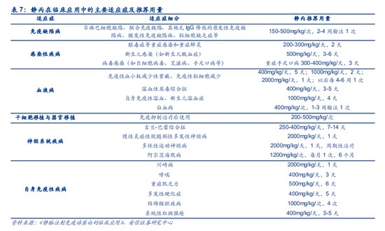 在众多适应症中,原发性免疫缺陷症、川崎病、免疫性血小板减少性紫癜等疾病被认为是静丙疗效确定的疾病;感染性疾病(特别是病毒感染性疾病)、免疫性疾病等被认为是静丙在临床中有一定效果的疾病。根据临床推荐用量,按平均体重 60kg 测算,静丙的单人单疗程用量普遍在 120g 左右,折合 48 瓶(2.5g/瓶),人均用量较大。