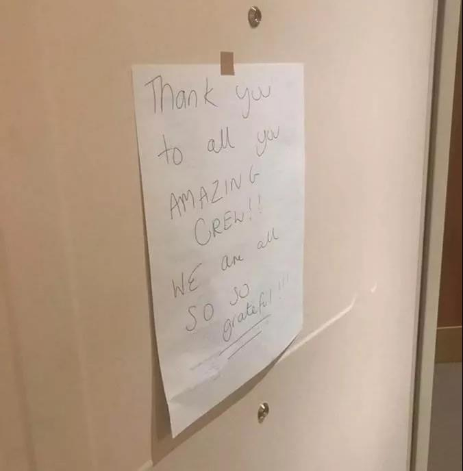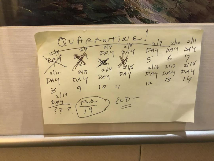 他们贴起了一块便利贴,每天划掉度过的日期。在被醒目圈起的 19 号后边,则是 3 个问号——19 号,是钻石公主号目前计划解除隔离的日子,眼下,他们很难预料事情的走向。盖曾写过一部关于邮轮谋杀案件的悬疑小说,提起这事,她笑道:“我们都觉得挺黑色幽默的。”