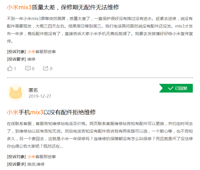 实际上,作为一部滑盖智能手机,小米MIX 3不时因产品质量问题和售后服务问题被消费者投诉。在黑猫投诉平台上,有多条投诉小米MIX 3出现黑屏、售后人员以没有配件为由拒绝维修手机的帖子。