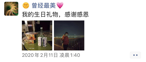 2月11日的凌晨,袁智清终于在酒店大堂住下,他发了一条朋友圈,“我的生日礼物”,配图是志愿者送的食物,和他在武汉长江大桥上给老婆拍的一张照片。