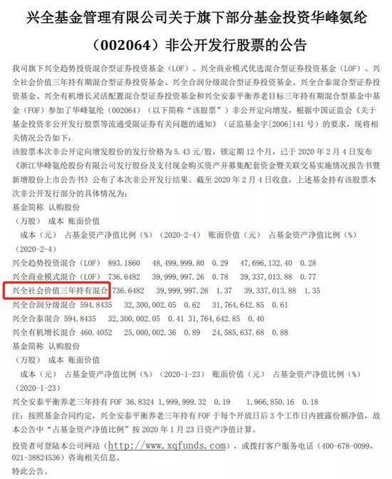 此外,公告显示,2月初兴全社会价值还参与了华峰氨纶的非公开定向增发,基金建仓正在进行。