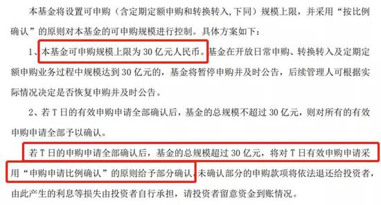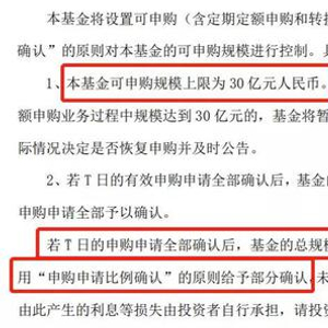 若某一个交易日的申购申请全部确认后,基金的总规模超过30亿元,将对该交易日有效申购申请采用“申购申请比例确认”的原则给予部分确认。