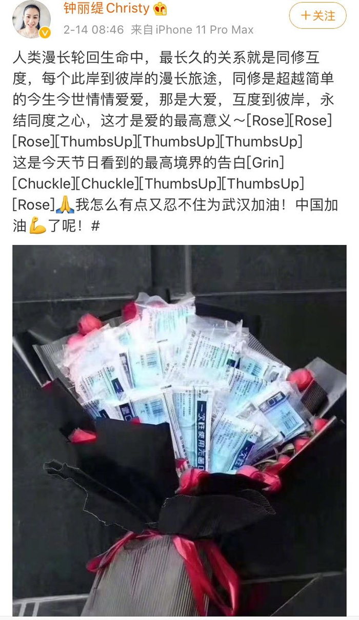 2月14日情人节一早,明星钟丽缇就在微博上晒出了一张口罩玫瑰花束,并配文称:“人类漫长轮回生命中,最长久的关系就是同修互度,每个此岸到彼岸的漫长旅途,同修是超越简单的今生今世情情爱爱,那是大爱,互度到彼岸,永结同度之心,这才是爱的最高意义。