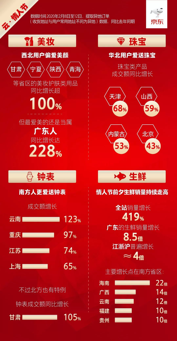 从异地订单的地域特色看,西北地区的用户比较偏爱美颜,发往甘肃、宁夏、陕西、青海等省区的美妆护肤类用品普遍成交额同比增长100%以上,不过最爱美的当属广东人,同比增长达228%;而华北地区用户比较爱给远方的爱人送珠宝,其中天津市的珠宝类成交额同比增长68%,山西增长59%,内蒙53%,北京增长43%;相比之下,南方人更爱送手表,其中云南的成交额增长123%,重庆增长97%,江苏增长74%,上海增长65%,不过北方省份也有强行插队者——甘肃省手表成交额同比增长105%。