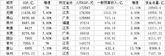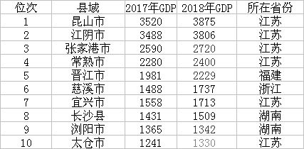 表2:中国县域GDP前十名(GDP单位:亿元)