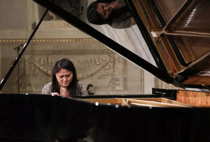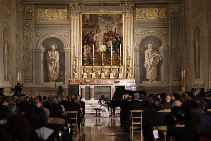 ▲2月13日,在意大利罗马总统府奎里纳莱宫,旅意华人钢琴家居觐在现场演奏。新华社记者 程婷婷 摄