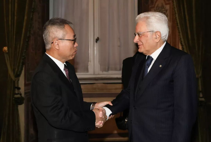 ▲2月13日,意大利总统马塔雷拉(右)在音乐会开始前于总统府会见中国驻意大利大使李军华。新华社记者 程婷婷 摄