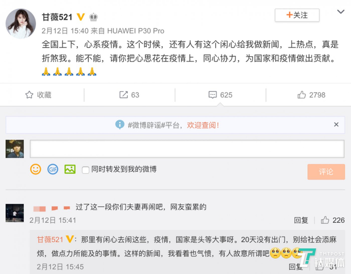 下午,甘薇发出一条微博,疑似作出回应,称有人给她做新闻上热点,真是折煞我。她在回复网友评论时表示,自己已经20天没有出门,近来一直关注着疫情,孩子们主动提出把压岁钱都全部捐出来,支援灾区。